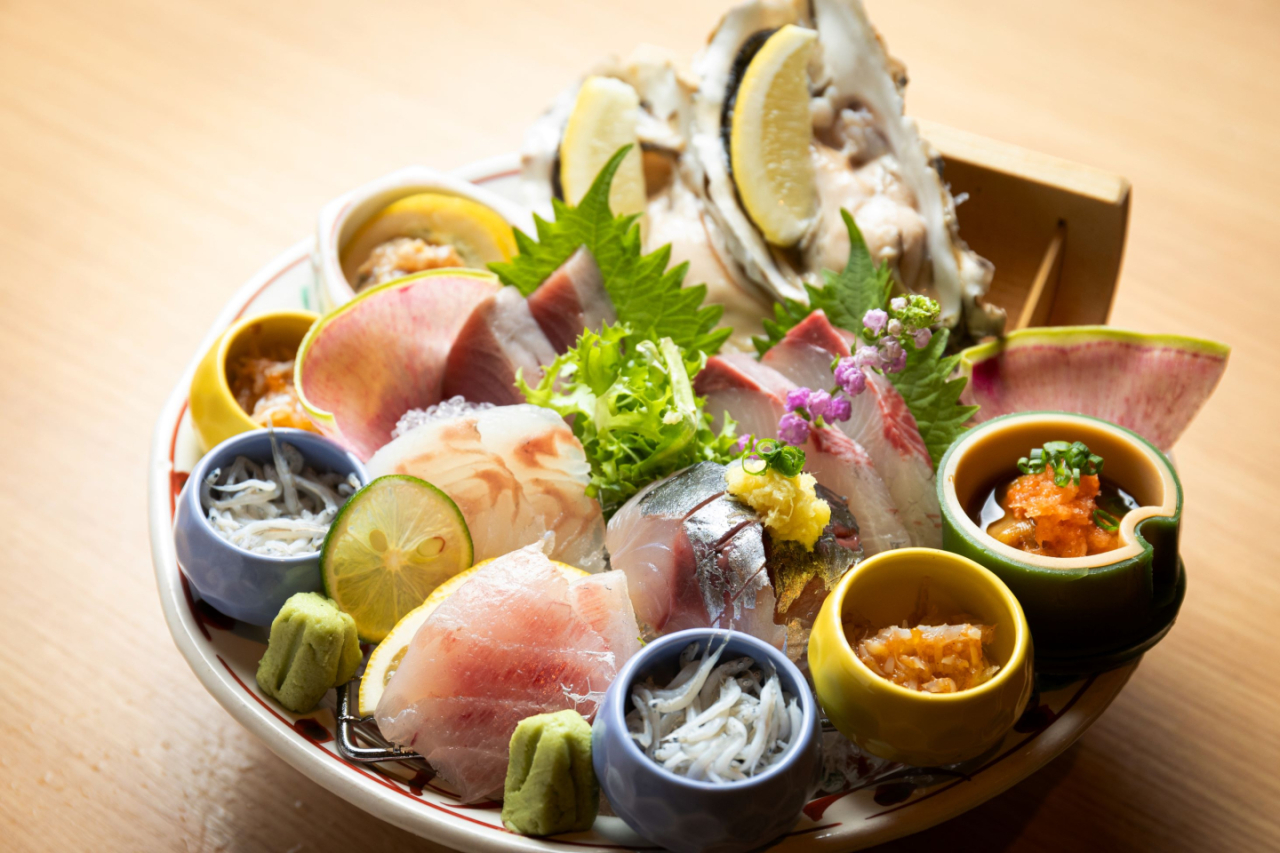 前菜や鮮魚のお造り盛り、殻付き牡蠣など、季節ごとに選び抜いた食材を、心を込めたコース仕立てでご提供いたします。